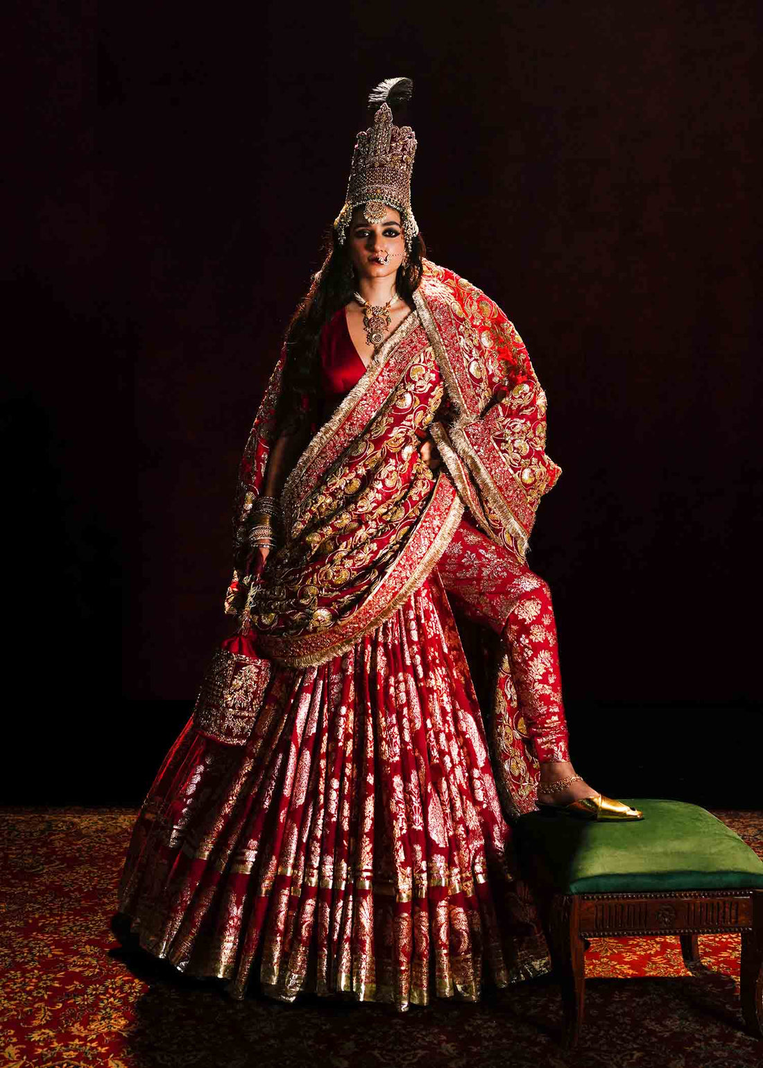 Zauq-Red Banarasi Lehenga with Satin Silk Choli & Gotta Work Dupatta