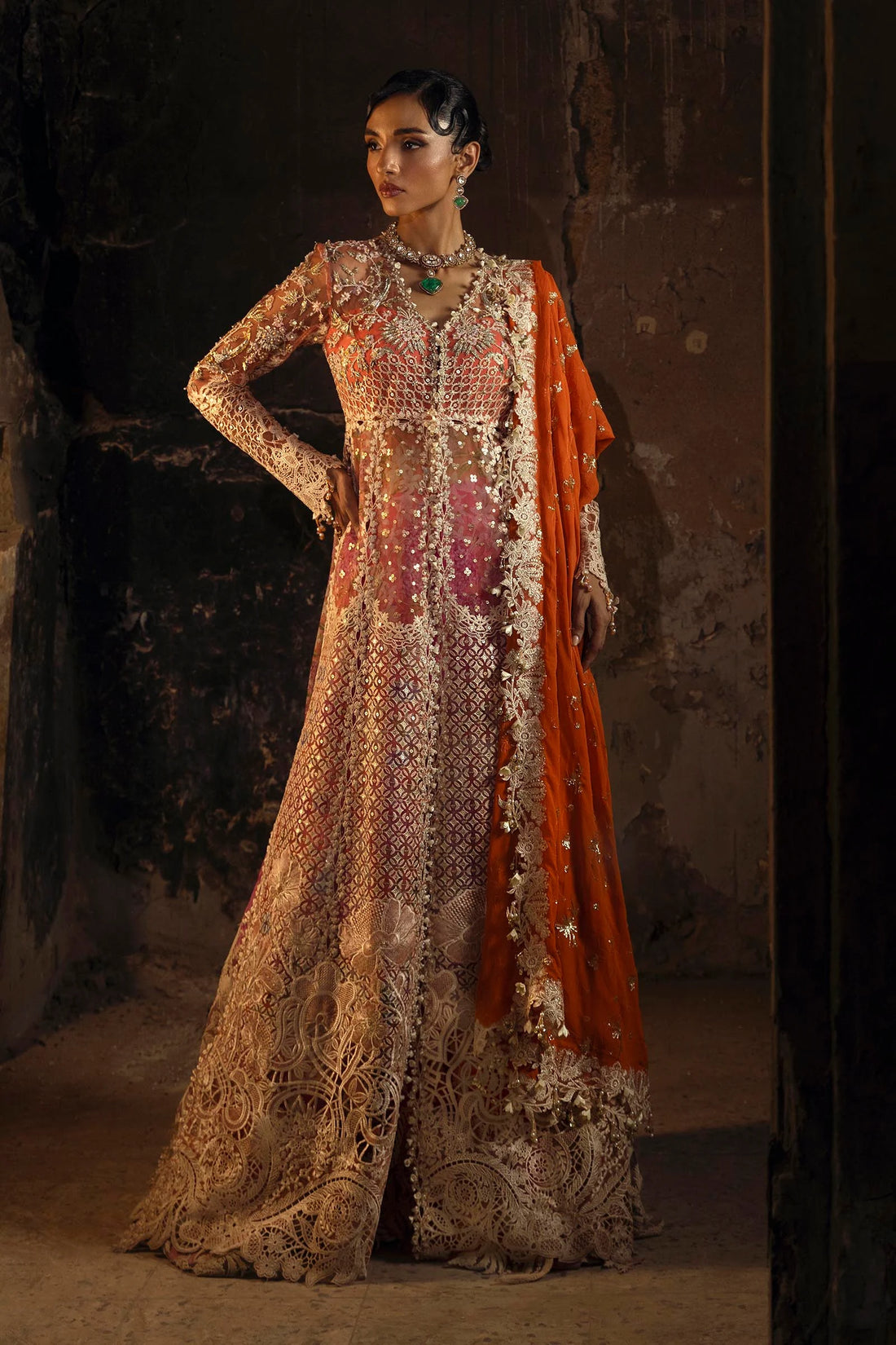 Description: A dreamy powder pink organza ensemble, adorned with delicate embellishments and intricate cutwork detailing. The...