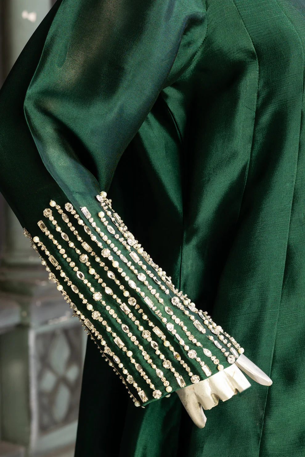Make a striking statement in this dark green sheesha silk outfit, crafted with luxurious fabric and exquisite detailing. The long, straight-cut shirt features delicate pearl embellishments on the sleeves, adding a touch of elegance. Paired with matching silk pants adorned with intricate beadwork, this ensemble is perfect for formal gatherings and celebrations. Completing the look is a flowy organza dupatta, edged with fine embellishments for a graceful finish. This sophisticated and timeless green outfit is ideal for weddings, festive occasions, and evening wear, offering a blend of luxury and tradition
