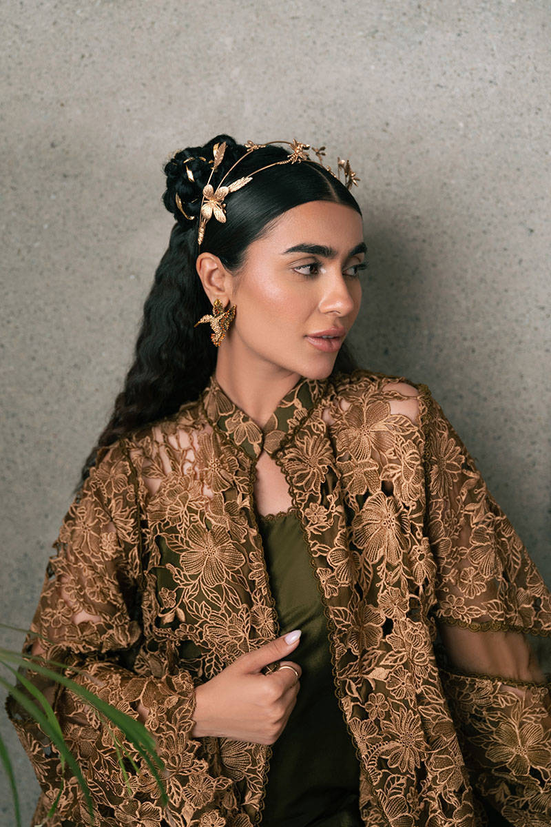 Unveil the opulence of Mohsin Naveed Ranjha's "Mystic Pine" from the Chaye Coffee Luxury Pret Collection. This stunning ensemble, in rich pine green and lustrous bronze gold, consists of a jacket, inner shirt, and pants. The laser-cut, multi-head embroidered gown showcases a meadow of wildflowers in radiant gold, creating an enchanting visual. The front-open jacket, free of fastenings, reveals a sleek raw silk sleeveless inner shirt in deep pine green. The shirt is paired with boot-cut trousers hemmed with delicate trims.