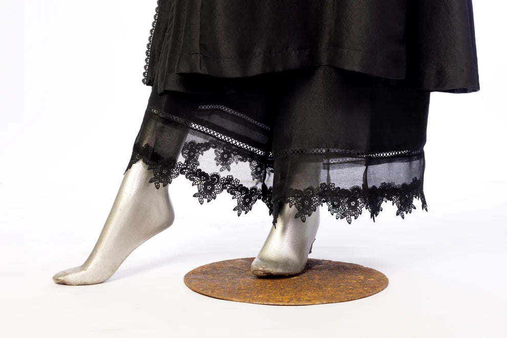 This elegant black embroidered shirt is paired with a finely detailed organza dupatta, offering a sophisticated and luxurious look. Paired with plain pants with lacing details at border, the ensemble is both chic and timeless. Perfect for evening events or formal occasions, it exudes class and refinement.